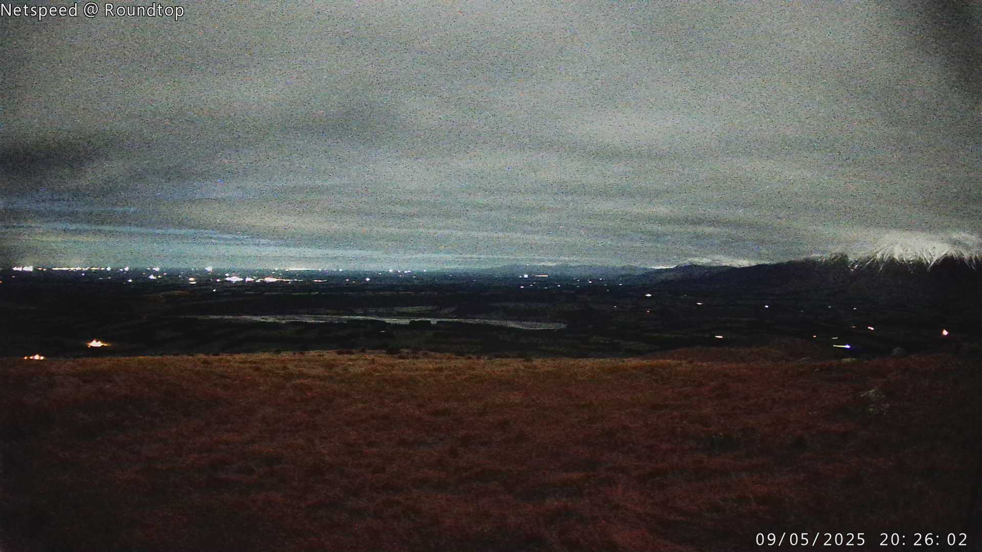 The view South from the top if Round Top looks down the Canterbury plains over the Rakaia River in the foreground, towards Mt Somers and Geraldine, Mt Hutt on the extreme right.